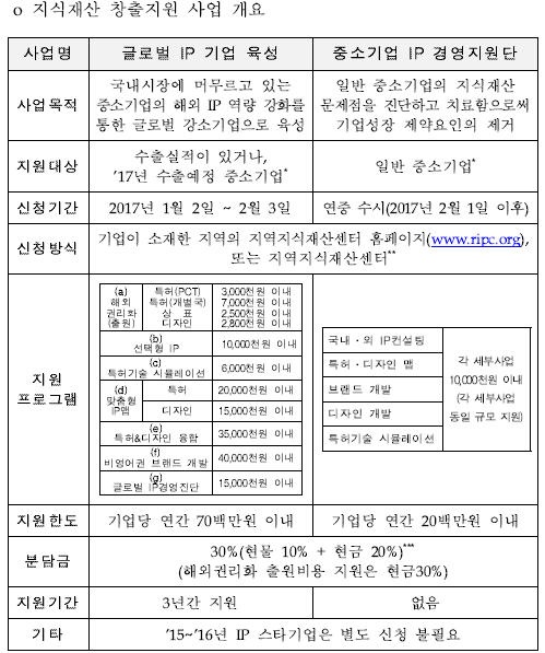2017년 「지식재산 창출지원」사업은 전국의 성장잠재력 있는 중소기업을 대상으로 하는 지식재산 지원 사업으로써, “글로벌 IP(Intellectual Property의 약자로 지식재산을 의미) 기업 육성” 및 “중소기업 IP 경영지원단”의 2가지 세부사업으로 구성된다.
