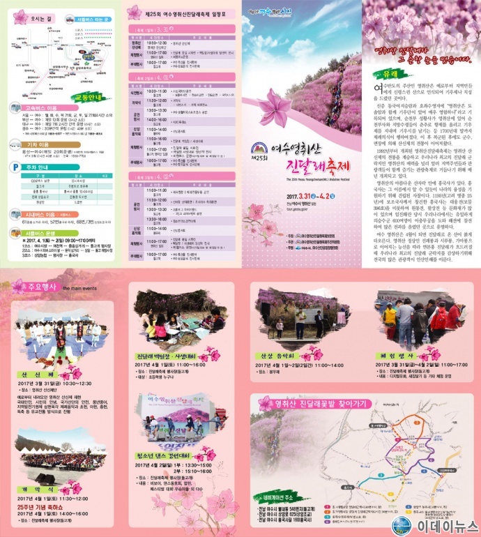 이데이뉴스 전국취재본부장 강진원 기자 남도의 봄 상춘객의 가슴을 설레이게하는 「제25회 전남 여수 영취산 진달래 축제」가 전남 여수시 월내동 548번지 돌고개 행사장 주무대에서 3. 31.(금) ~ 4. 2.(일)까지 3일간 개최된다.