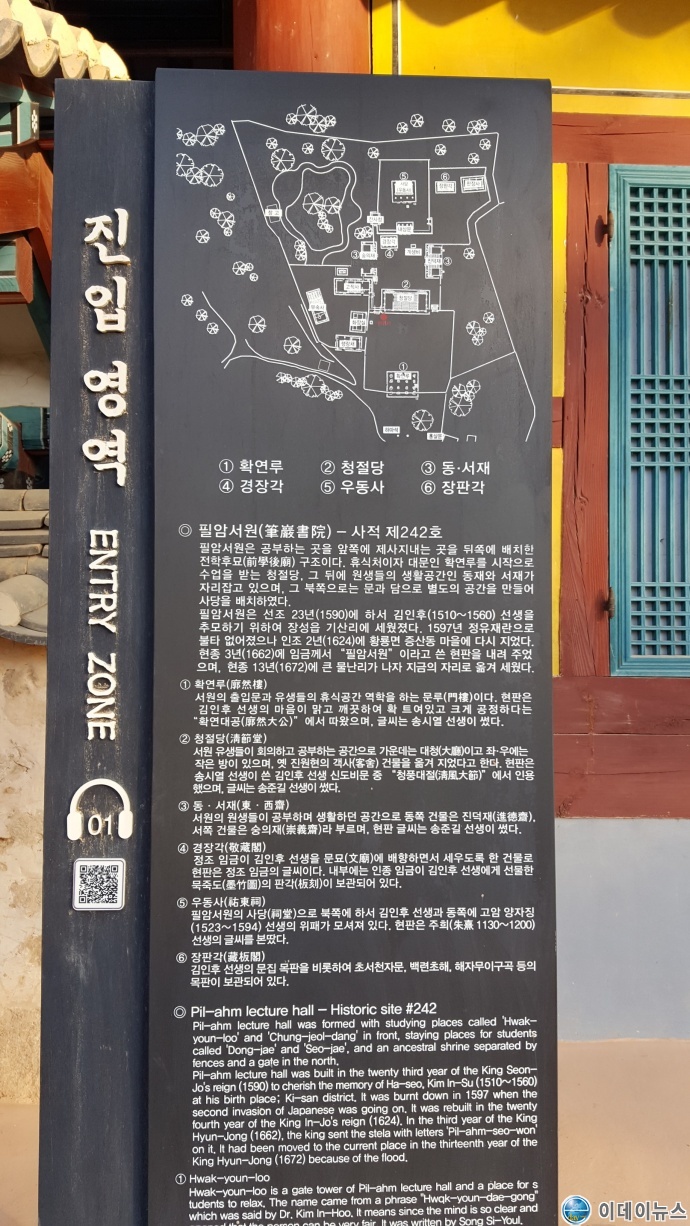 안내판에는 필암서원 개요와 배치도, 그리고 각 건물별 설명이 간단하게 되어 있다. 찬찬히 읽어보니 매우 유용한 정보이다.