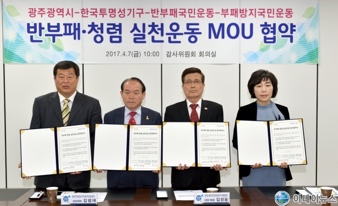 광주시는 7일 시청 5층 감사위원회 회의실에서 한국투명성기구 광주·전남본부, 반부패국민연대 광주광역시연합회, 부패방지국민운동 광주광역시총연합회와 반부패·청렴실천운동 업무협약을 체결했다고 밝혔다.