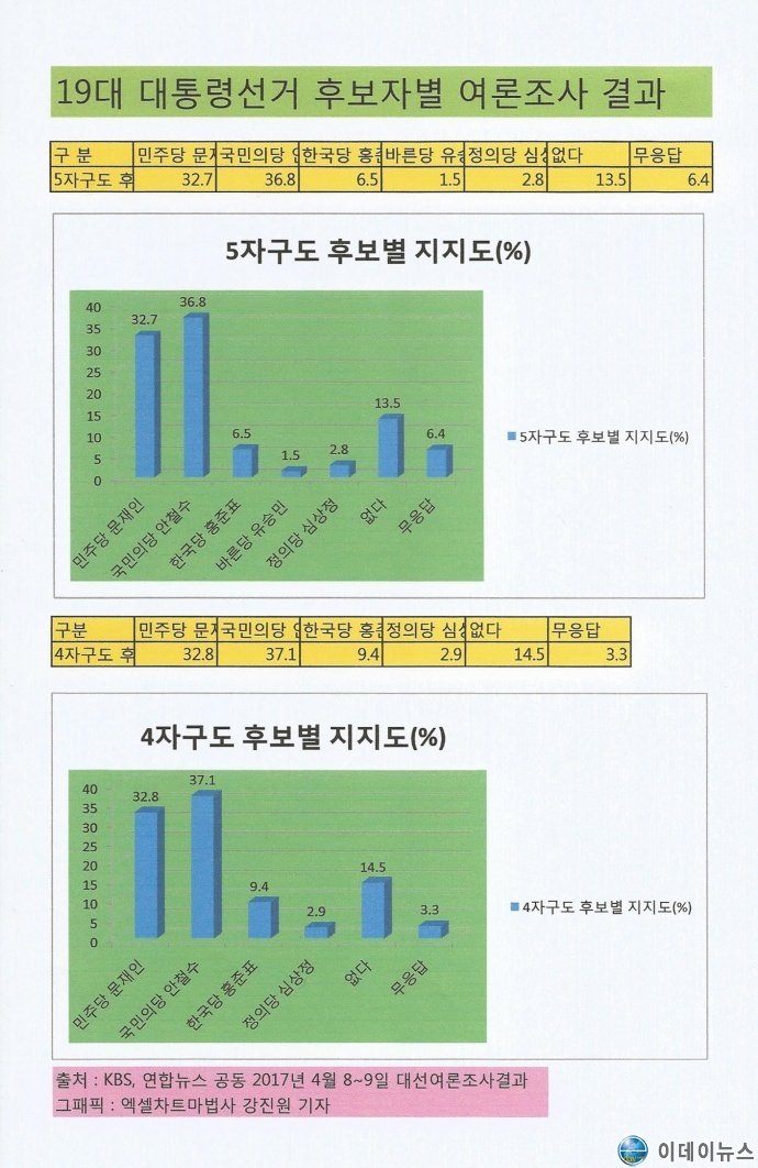 먼저 5자구도 대결시에는 더불어민주당 문재인 후보 32.7%, 국민의당 안철수 후보는 36.8%, 자유한국당 홍준표 후보 6.5%, 바른정당 유승민 후보 1.5%, 정의당 심상정 후보 2.8%, 없다 15.5%, 무응답 6.4%로 조사되어 대선후보 여론조사이후 처음으로 안철수 후보가 오차범위 내 1위를 차지했다.