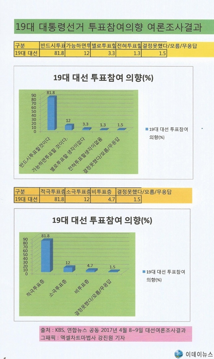 한편 「19대 대통령 선거 투표참여의향 여론조사결과」에서는 반드시 투표할것이다 81.8%, 가능하면 투표할것이다 12%, 별로 투표할 생각이 없다 3.3%, 전혀 투표할 생각이 없다 1.3%, 결정 못했거나 모름 무응답 1.5%로 조사되었으며, 투표참여의향 성향별로는 적극투표층 81.8%, 소극투표층 12%, 비투표층 4.7%, 결정 못했거나 모름 무응답 1.5%로 조사되었다.