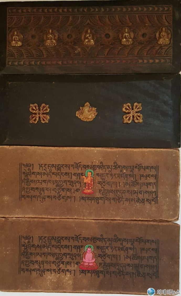 ▲5백년된 다라니경 -위 판 2개는 표지이고 밑의 2개판은 다라니경이 적힌 속지다<장흥신문사 김선욱 기자 제공>