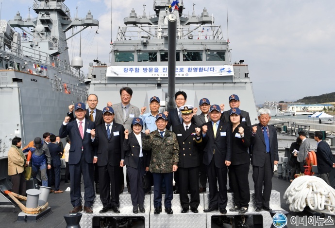윤장현 광주광역시장이 14일 오후 전남 목포 해군3함대사령부에서 열린 광주광역시-광주함 자매결연식에 참석해 이은방 광주시의회 의장, 임찬재 광주함장 등 주요 내빈들이 함수에서 기념촬영을 하고 있다