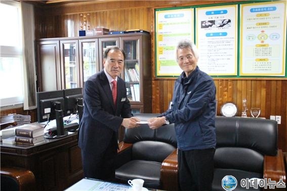 【장학금 전달식을 하고 있는 정창용 교장과 이종효 할머니의 남동생】
