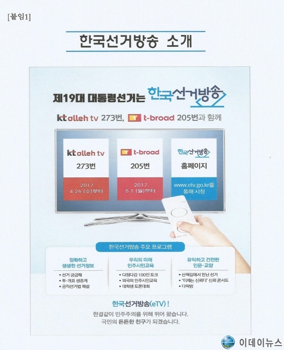 중앙선거관리위원회는 제19대 대통령선거 투‧개표 생중계 등 다양한 선거정보를 한국선거방송(eTV)을 통하여 TV 방송으로 제공한다.
