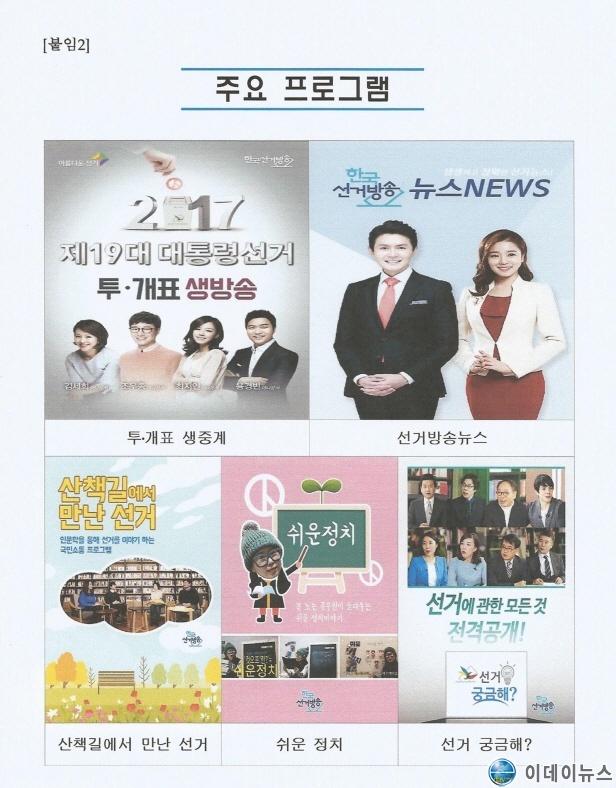 주요 프로그램은 ▲정확한 선거정보를 제공하는 ‘투·개표 생중계’, ‘선거 궁금해’, ‘공직선거법 해설’, ▲민주시민의식 함양을 주제로 ‘다정다감 100인 토크’, ‘대학생 토론대회’, ▲선거와 인문‧교양을 접목한 ‘산책길에서 만난 선거’, ‘이제는 신뢰다.’ 토크 콘서트 등이다.