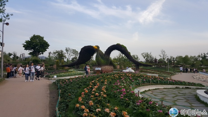 순천만국가정원 동문쪽 세계각국정원 입구에 자리잡은 흑두루미 형상 꽃탑이 아름다운 자태로 관광객들의 포토존 명소로 두각을 나타내고 있다.