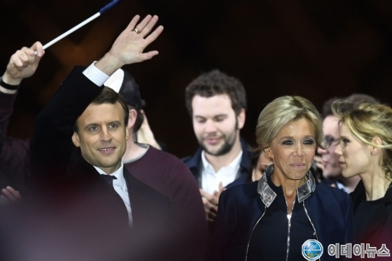 프랑스 대통령선거 결선투표에서 압승해 최연소 대통령으로 당선된 중도신당 앙마르슈의 에마뉘엘 마크롱(39)과 그의 아내 브리지트 트로뉴(63).7일(현지시간) 치러진 프랑스 대통령선거 결선투표에서 중도신당 앙마르슈의 에마뉘엘 마크롱(39)이 극우진영 국민전선의 마린 르펜(48)에게 압승을 거둬 프랑스 역대 최연소 대통령에 당선됐다.