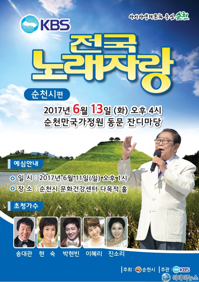 노래자랑은 국민MC 송해 선생의 진행으로 송대관, 현숙, 박현빈 등 초대가수들이 참여해 뜨거운 무대를 선사할 예정으로 참가자격은 순천시 관내에 거주하고 있는 시민이면 누구나 신청 가능하며, 다음달 8일까지 읍면동사무소에 신청하면 된다.