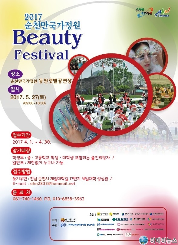 27일 오전 9시부터 동천 갯벌공연장에서는 전국 1000여명의 뷰티인들이 참여해 뷰티 페스티벌이 열리며, 피부, 헤어, 아트, 네일, 메이크업 5개 분야별로 일반부, 고등부, 대학부로 구분하여 자기만의 기량을 마음껏 선보이게 된다.