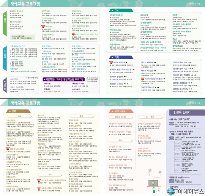 또한, 여름방학 시즌을 맞아 ‘손에 잡히는 코딩’‘언플러그드 코딩’ 등 초등학생방학특강과, ‘내 자녀 결혼전략’‘음악을 그리는 화가 이순형과 함께하는 예술산책’‘찬밥세제 비누만들기’ 등 일일특강, ‘나를 찾는 인문학-심리학’‘청소년과 학부모를 위한 인문학-예술, 세상을 바라보는 창’ 등 인문학컬리지도 마련된다.