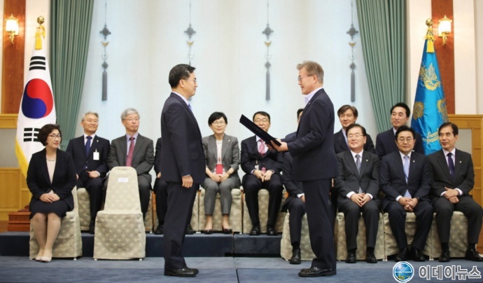 문재인 대통령은 9일 청와대에서 국회인사청문회를 통과한 김동현(60세, 충북)경제부총리 겸 기획재정부 장관에게 임명장을 수여했다.