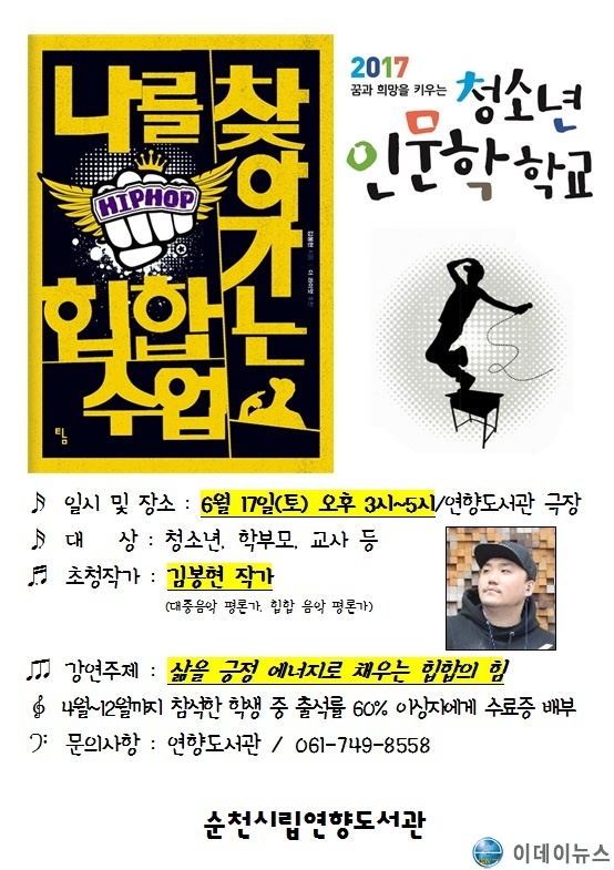 오는 17일 오후 3시 연향도서관 극장에서 열리는 인문학학교에서 김봉현 작가는 ‘삶을 긍정에너지로 채우는 힙합의 힘’을 주제로 청소년들과 이야기를 나눌 예정이다.