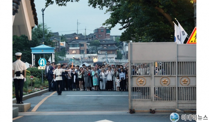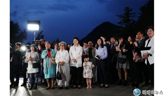 지난 6월 26일 밤 8시 문재인 대통령 영부인 김정숙 여사가 참석한 가운데 청와대 앞길이 49년 만에 24시간 전면 개방하는 시민들이 참석하는 <한밤 산책 행사>행사가 열렸다.