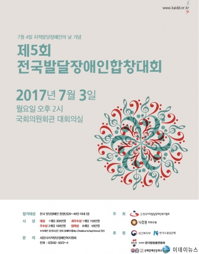 (사)한국지적발달장애인복지협회(회장 김성조)는 나경원국회의원실과 함께 제5회 전국발달장애인합창대회를 3일 오후 2시 국회의원회관 대회의실에서 한국수출입은행(은행장 최종구)과 보건복지부 후원으로 개최한다.