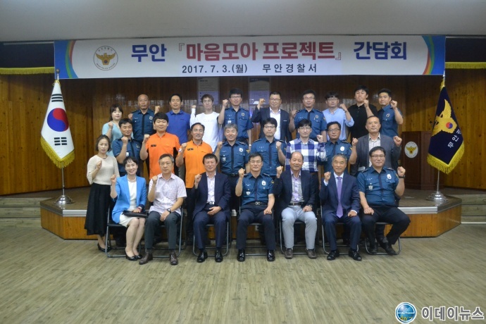 지난 7. 3. 14:00 경찰서 회의실에서 무안경찰서장 주관으로, 무안군청(주민복지실, 보건소), 무안소방서, 정신병원 치료시설을 갖춘 무안종합병원, 정신질환자 등 요양시설인 성산요양원, 경찰발전위원회, 경찰보안협력위원회, 관내 지구대장과 파출소장 등 30여명이 참석하는 『무안 마음모아 프로젝트』간담회를 하였다.