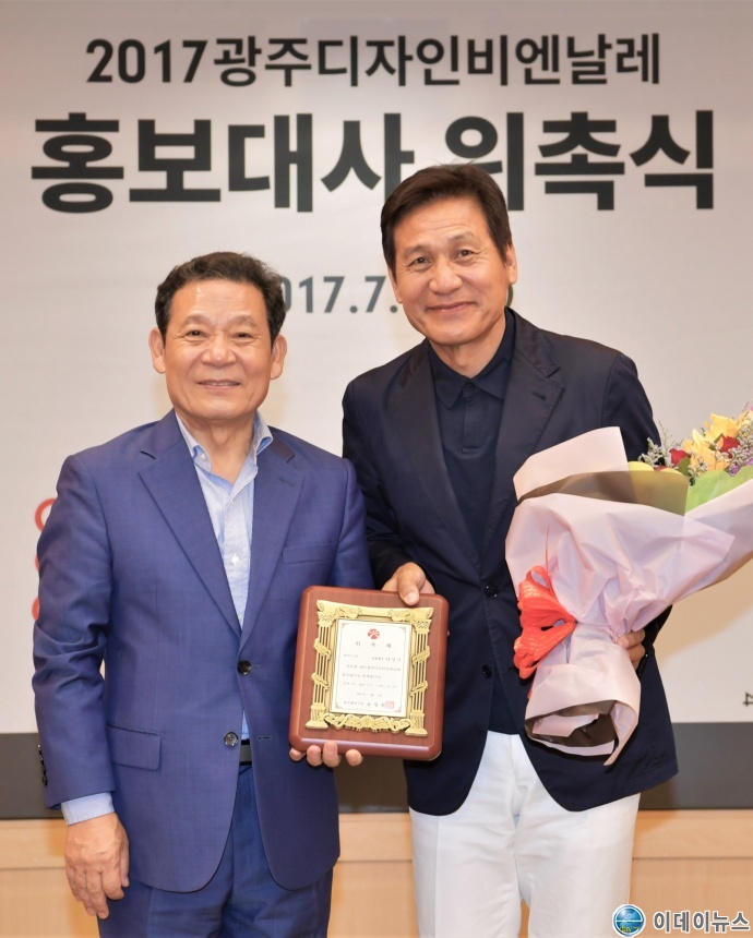 윤장현 광주광역시장이 5일 오후 시청 3층 비즈니스룸에서 열린 '2017 광주디자인비엔날레 명예홍보대사 위촉식'에 참석해 배우 안성기 씨에게 위촉패를 전달한 뒤 기념촬영을 하고 있다.