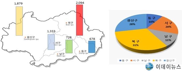119구조대가 가장 많이 출동한 곳은 아파트(33.8%)와 도로(11.3%), 단독주택(11.3%)순 이였으며 지역별로 북구(2094건)가 가장 많고 광산구(1879건), 서구(1333건), 남구(728건), 동구(678건) 등 순으로 나타났으며, 관할 구별 면적과 인구수에 비례하는 것으로 분석된다.