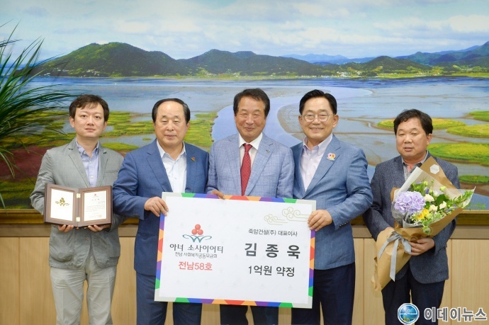 순천시는 지난 12일 순천상공회의소 김종욱 회장이 5년 동안 1억원의 성금을 기부하기로 약정하고 전남 아너 소사이어티(Honor Society) 58호 회원에 가입했다.