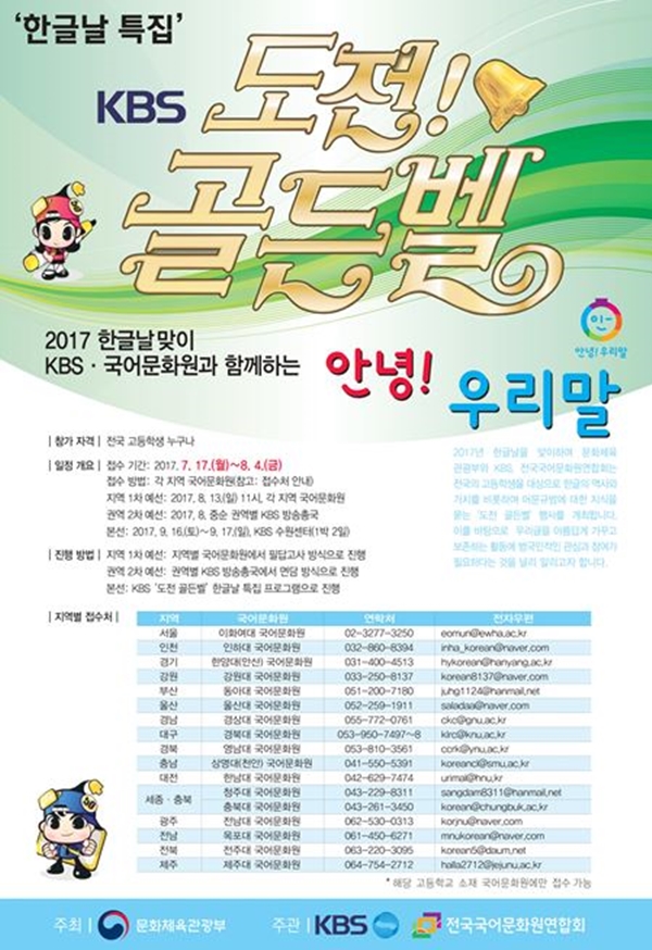 문화체육관광부(장관 도종환, 이하 문체부)는 올해로 571돌을 맞이하는 한글날에 한국방송공사(사장 고대영), 전국국어문화원연합회(회장 김미형)와 함께 `한국방송(KBS) 도전 골든벨 한글날 특집`을 개최하기 위해 오늘(17일)부터 다음 달(8월) 4일까지 전국의 고등학생을 대상으로 참가자를 모집한다.