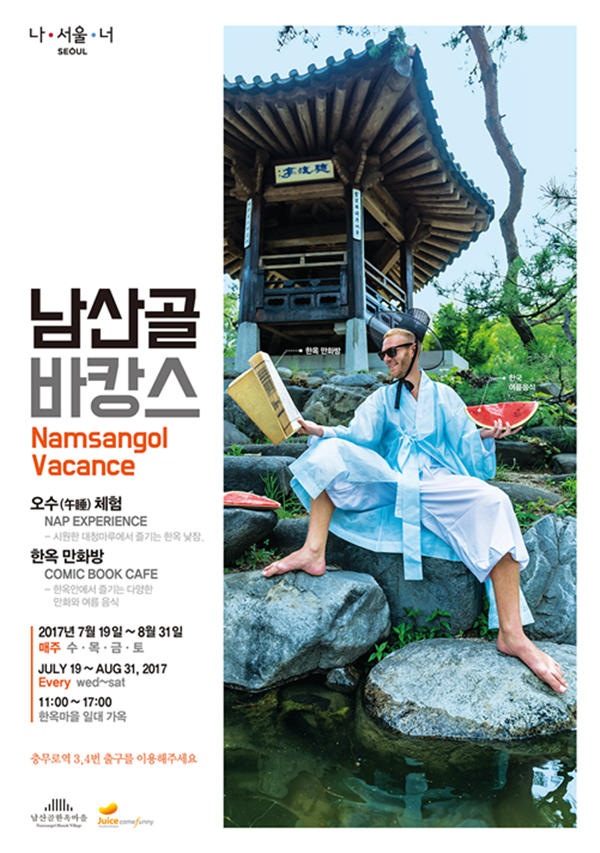 이번 `남산골 바캉스` 프로그램은 요즘 사람들 사이에서 유행하고 있는 낮잠카페, 북&만화카페 등 체험을 현대적 공간이 아닌 전통적 한옥 공간에서 즐길 수 있는 색 다른 경험의 기회가 될 것이다. 남산골한옥마을 입장료는 무료, 체험비는 유로로 진행되며 오는 19일 다음 달(8월) 31일까지 오전 11시부터 오후 5시까지 한옥마을 가옥 곳곳에서 체험할 수 있다.
