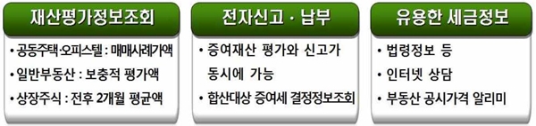 특히 전국의 공동주택과 수도권ㆍ지방 5대 광역시 소재 오피스텔의 유사재산 매매사례가액을 제공해 납세자가 손쉽게 상속ㆍ증여재산의 시가를 확인할 수 있도록 했다. 납세자는 상속ㆍ증여재산 평가 정보를 조회하고 확인된 증여재산 가액으로 바로 증여세를 전자신고하고 납부할 수 있다. 다만 상속세는 각종 공제제도가 많고 신고 방법이 복잡해 전자신고는 할 수 없다.