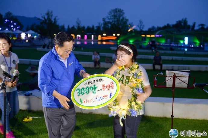 300만 번째 관람객으로 입장한 부가영 씨(제주도, 27세)는 “여름방학을 맞아 친구들과 내일로 여행을 하던 중 한여름밤의 물빛축제를 보러 순천에 들렀는데, 300만 번째 입장이라는 소중한 추억 하나를 만들어 가게 되어 기쁘다”고 소감을 밝혔다.