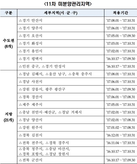앞선 10차 미분양관리지역 중 경기 남양주시, 인천 연수구, 충남 서산시, 경북 구미시의 경우 모니터링 기간 동안 미분양이 감소하거나 증가세가 두드러지지 않아 관리지역에서 제외됐다.