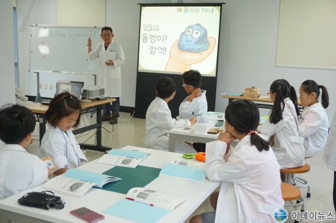 올해는 1차로 7일부터 11일까지 진행되는 7기 과정에 관내 초등학생 16명이 참여했고, 교육은 과학교사 출신의 지질공원해설사가 강의를 맡고, 보조교사를 포함해 7명의 지질공원해설사가 실험을 돕고 있다.