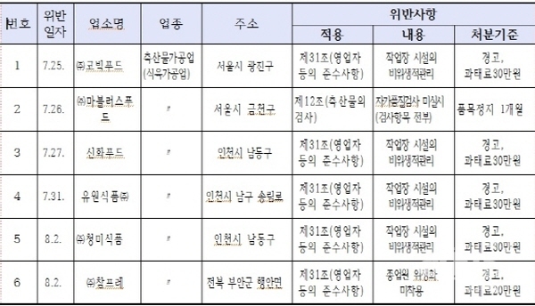 식약처의 점검결과 ▲작업장 시설의 비위생적 관리 4곳 ▲생산현장 종사자 위생화 미착용 1곳 ▲자가품질 검사 미실시 1곳 등 기본수칙을 위반한 6곳을 적발했다. 다만 분쇄가공육제품 186개 제품을 수거하여 장출혈성대장균 등 위해미생물의 오염 여부를 검사한 결과는 모두 적합했다고 밝혔다.