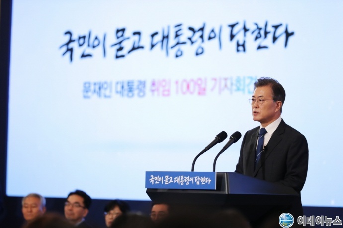 문재인 대통령이 17일 오전 11시 청와대 영빈관에서 내외신 기자 250여명이 참석한 가운데, 약 1시간 동안 취임 100일을 맞아 ‘국민이 묻고 대통령이 답하다.’ 라는 내외신 합동 기자회견을 열었다.
