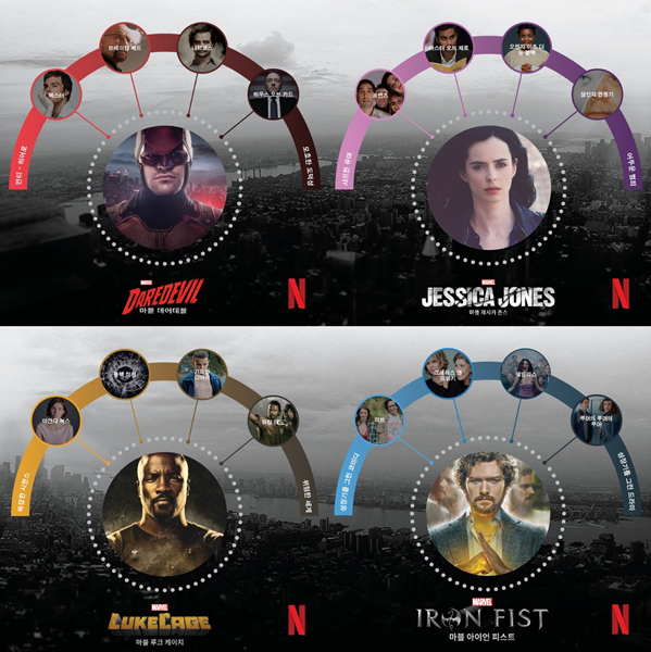 또한 단 한번도 마블 시리즈를 접하지 않았던 시청자들이 디펜더스의 네 주인공들을 만나게 된 경위를 보면, 그들을 마블 정주행의 길로 이끈 특징적인 취향을 볼 수 있다.