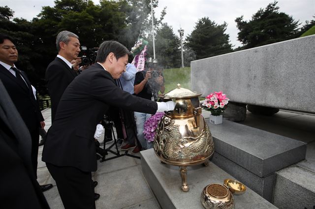 안 대표는 지난해 2월 천정배 전 대표와 공동대표 체제로 현충원을 참배했을 당시에는 현충탑만 참배했다. 또 2014년 3월 새정치민주연합 창당 때도 대전현충원만 방문했다. 두 사례 모두 호남과 야권 지지층이 이승만ㆍ박정희 전 대통령 묘소 참배에 대한 강하게 반발했던 상황을 고려한 행보였다. 논란이 될 때는 보수 성향 대통령 참배는 피하고, 단독 혹은 자신이 주도해 방문할 때만 이들 대통령 묘역까지 찾은 셈이다.