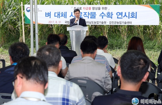 전남 강진군이 지난 31일 쌀 과잉공급 해소와 안정적인 조사료 수급의 중요성을 알리고자 ‘벼 대체 사료작물 수확 연시회’를 개최했다.
