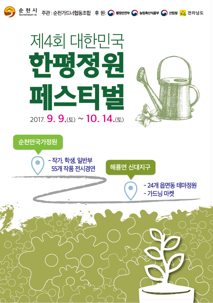 특히, 올해는 해룡면 신대지구(외국인학교부지)에 순천시 24개 읍면동이 참여하여 읍면동별 특징을 반영한 ‘무한상상 테마정원’을 조성하여 전시하고, 가든마켓도 함께 열릴 예정이어서 9월부터 10월까지 순천시는 볼거리 풍성한 정원의 도시가 될 것으로 기대된다.