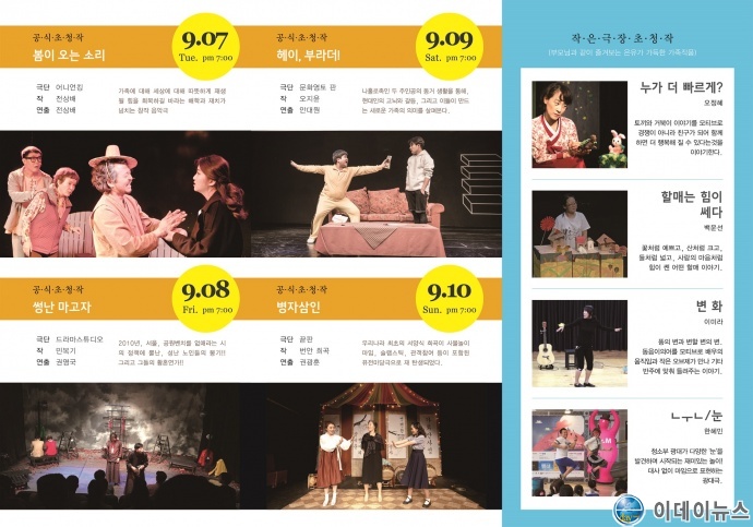 공식 초청작으로는 <봄이오는 소리>(극단 어니언킹), <썽난마고자>(극단 드라마스튜디어), <헤이,부리더!>(극단 문화영토-판), <병자삼인>(극단 끝판) 등 국내의 매력적인 작품들을 선보인다.