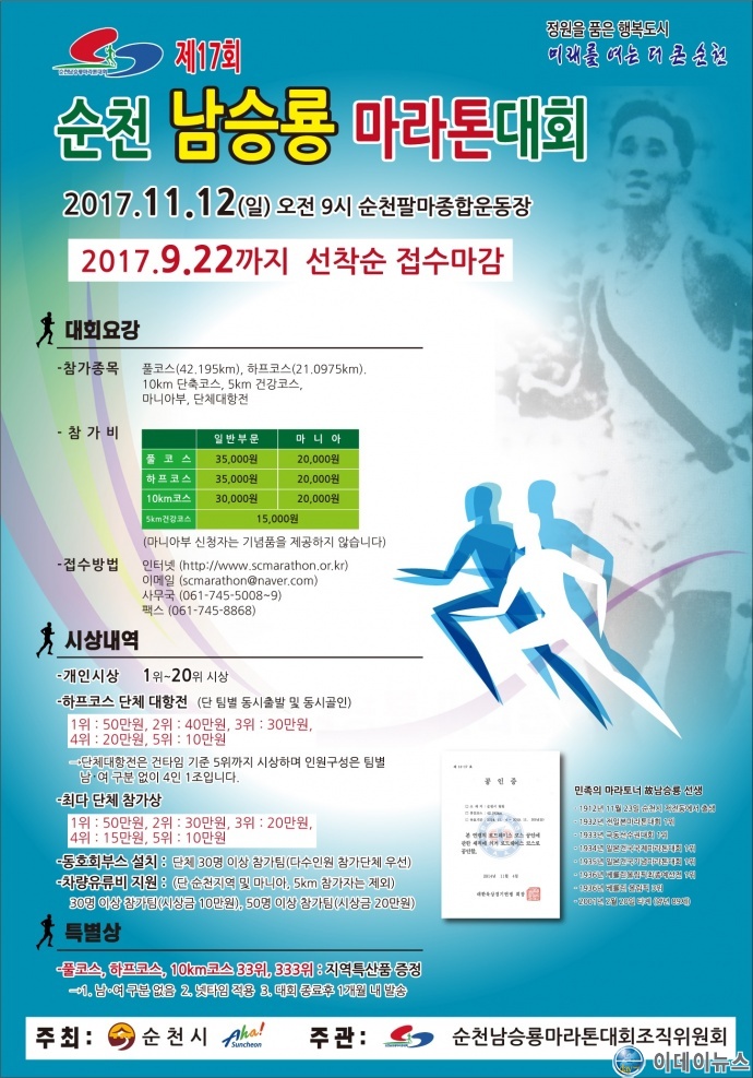 순천의 대표 스포츠행사로 자리매김하고 있는 ‘제17회 순천남승룡마라톤대회’가 오는 11월 12일 순천팔마종합운동장에서 개최된다.