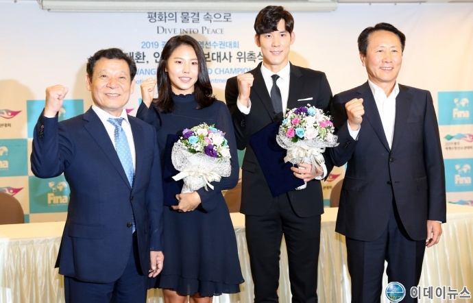 윤장현 광주광역시장이 6일 오후 서울 중구 프레스센터에서 열린 2019 광주세계수영선수권 홍보대사 위촉식에 참석해 한국 수영의 간판스타인 박태환과 안세현 선수에게 위촉장을 전달한 뒤 대회 엠블렘, 마스코트인 '수리, 달이'와 기념촬영을 하고 있다.