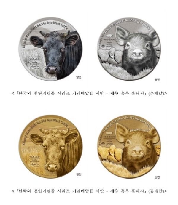 `제주 흑우ㆍ흑돼지 기념메달`은 80mm 고심도(高深度)의 은메달과 동메달 2종으로 구성되며, 국립문화재연구소가 자료를 제공하고 한국조폐공사의 특수압인기술을 활용해 제작된다. 이 기념메달은 오는 25일부터 `한국조폐공사 쇼핑몰`을 통해 구매할 수 있다.