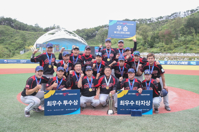 [아유경제=조현우 기자] 횡성베이스볼파크에서 이달 17일 열린 2017 KBO 챌린저스 직장인 야구대회 결승전에서 경북 쏠라이트가 지난해 우승팀인 울산 세종공업을 20:1로 꺾고 우승을 차지했다.