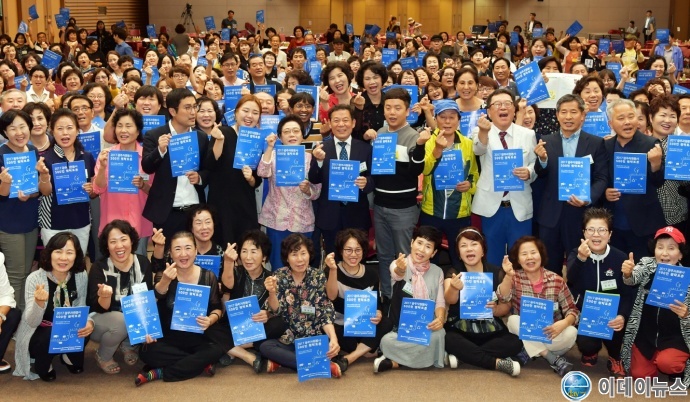 윤장현 광주광역시장이 20일 오후 서구 김대중컨벤션터 4층 컨벤션홀에서 '시민사회에서 자원봉사의 역할'을 주제로 열린 '자원봉사 500인 원탁회의'에 참석해 자원봉사자들과 기념촬영을 하고 있다.