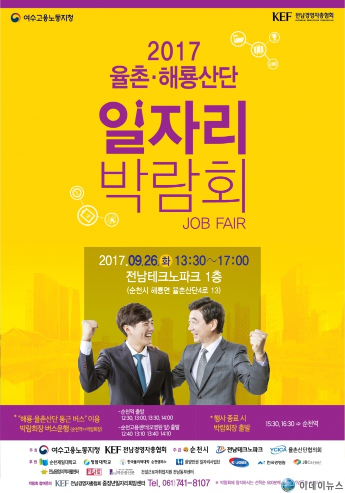 순천시는 오는 26일 오후 1시 30분부터 5시까지 전남테크노파크 1층(본원 지식벤처동)에서 ‘2017 율촌·해룡산단 일자리박람회’를 개최한다.