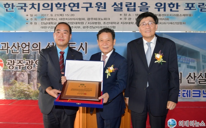 이날 윤장현 시장은 (사)한국치과기재산업협회(회장 임훈택)와 대한치과의사협회 (회장 김철수)로부터 광주시의 치과산업 발전과 치과용소재부품기술지원센터 설립에 기여한 공로로 감사패를 받았다.