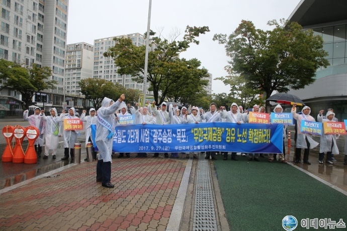 무안국제공항활성화추진위원회(위원장 박일상, 이하 추진위)는 27일 오전 더불어민주당의 광주․전남 합동 최고위원 회의 및 민생예산정책협의회가 개최된 광주 김대중컨벤션센터 앞에서 ‘호남고속철도 2단계사업의 무안국제공항 경유 확정’을 촉구하는 집회를 열고 성명서를 발표했다.