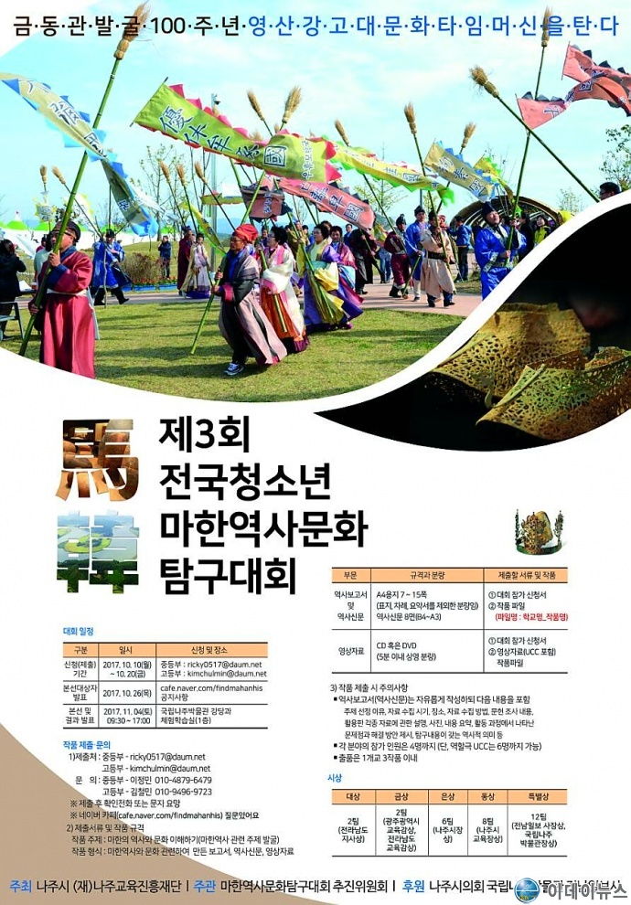 나주시(시장 강인규)와 나주교육진흥재단이 주최하는 이번 대회는 전국의 중·고교학생을 대상으로 이달 10일부터 20일까지 ‘마한의 역사와 문화’를 주제로 한 역사보고서, 역사신문, 영상자료(UCC)를 공모한다.