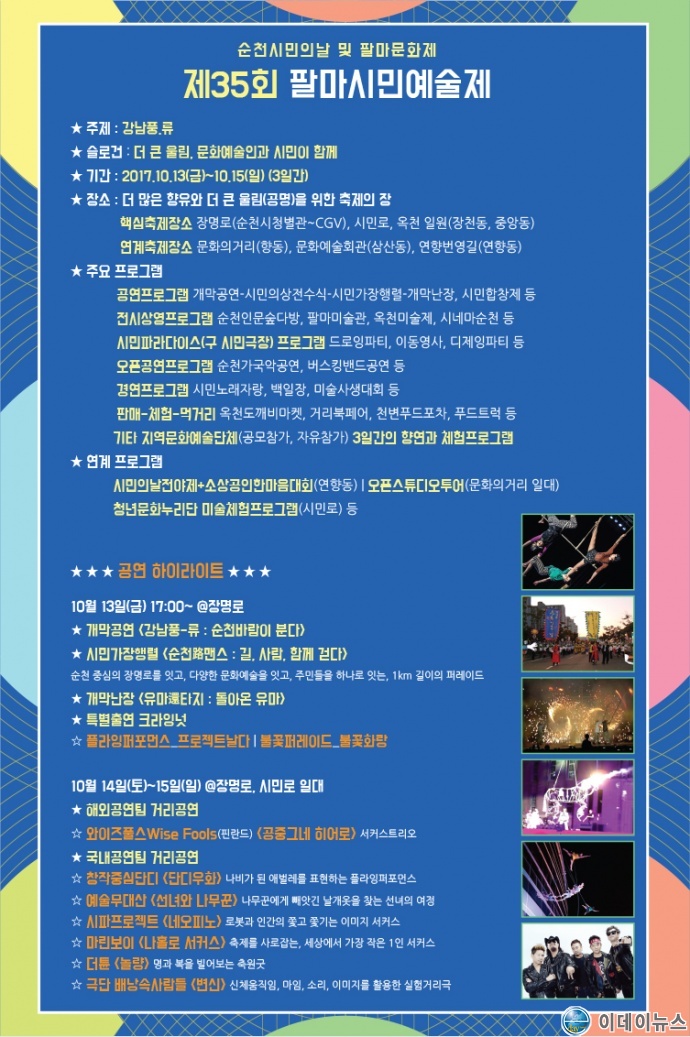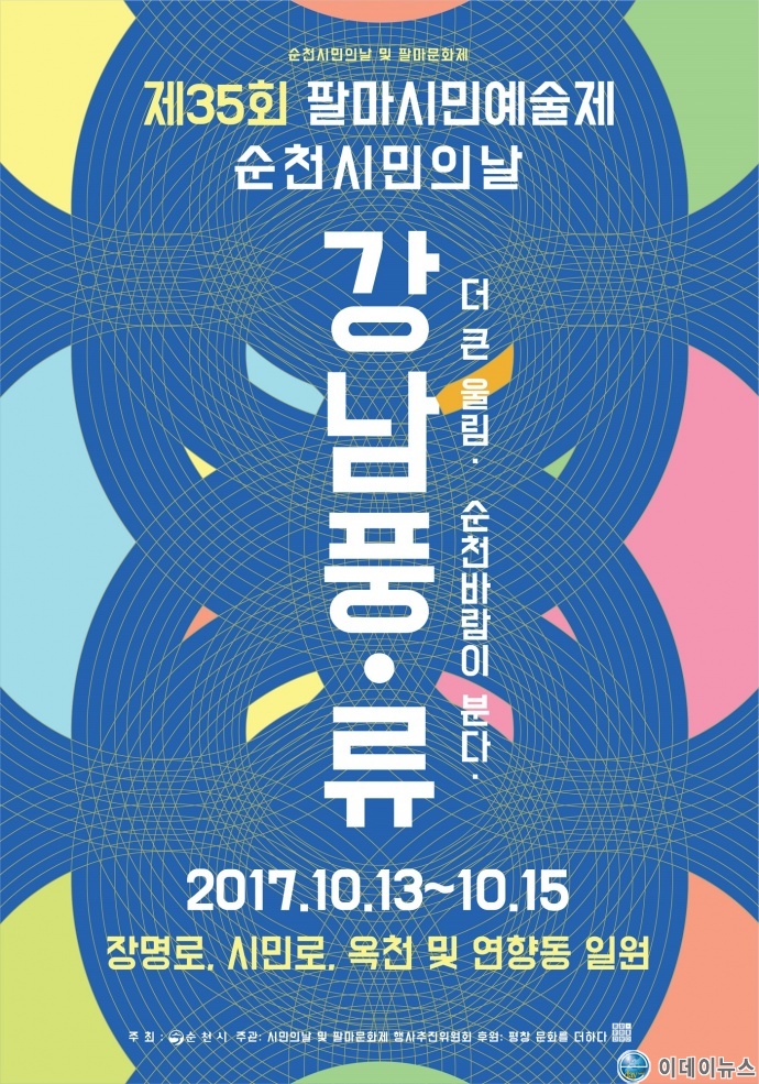 순천시는 ‘제35회 팔마시민예술제’를 오는 13일부터 15일까지 시청 앞 광장, 장명로 및 시민로, 연향 패션의 거리 일원에서 ‘더 큰 울림, 문화예술인과 시민이 함께’라는 슬로건으로 다채롭게 펼친다.