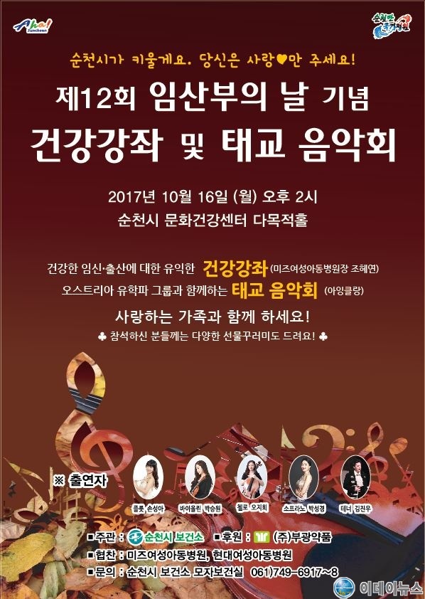 순천시는 오는 16일 오후 2시 문화건강센터 다목적홀에서 제12회 임산부의 날을 맞아 임산부 및 출산장려를 위한 건강강좌와 태교 음악회를 개최한다.