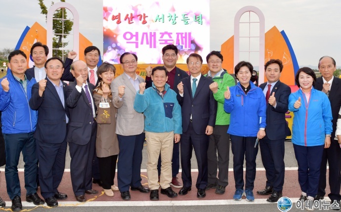 윤장현 광주광역시장이 14일 오후 서구 서창동 극락교 앞 특설무대에서 열린 '제3회 영산강 서창들녘 억새축제' 개막식에 참석해 인사말을 하고 있다. 이번 억새축제는 오는 21일까지 8일간 극락교에서 서창교까지 3.5㎞ 구간의 영산강을 따라 억새 길과 코스모스를 배경으로 진행된다.