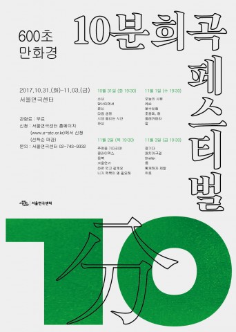 `10분희곡 페스티벌(예술감독 정소정)`은 연극 전문 웹진 `연극in`에 게재된 10분짜리 단편 희곡을 무대화하는 축제다. 젊은 극작가뿐 아니라 취미로 글을 쓰는 회사원부터 학생까지 다양한 사람들이 자신만의 희곡을 발표하는 장이다. 올해로 4회째를 맞이한 `10분희곡 페스티벌`은 총 24편의 단편 희곡이 무대에 오른다.